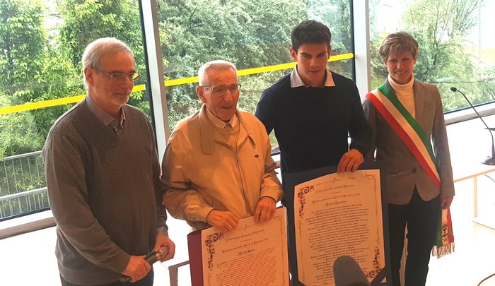 la processione a lago, la benedizione delle imbarcazioni e i fuochi d’artificio, ma San Vittore ha avuto la sua festa. Ieri la patronale verbanese s’è aperta al mattino con l’affollato –nonostante il maltempo– stand gastronomico dei Pacian da Intra, che hanno servito risott, luganiga e scigull, addolcendo la mattinata con la torta donata dalla Casa del dolce. Alle 18 il foyer del “Maggiore” ha accolto i due benemeriti verbanesi del 2019: Carlo Sada e Carlo Tacchini. Omonimi divisi da sessant’anni tondi di età (84 il primo, 24 il secondo) hanno in comune costanza e impegno. Il primo è una colonna della comunità di Fondotoce e del volontariato. È stato tra i promotori della protezione civile di cui è ancora attivo protagonista. Il secondo è uno sportivo (arruolato nel gruppo sportivo della polizia: le Fiamme Oro) la cui carriera è decollata negli ultimi anni portandolo a essere il primo canoista italiano della specialità canadese a qualificarsi per le Olimpiadi e a lottare ai vertici mondiali di questa specialità. A consegnar loro la benemerenza sono stati, ieri, il presidente del Consiglio comunale Pier Giorgio Varini e il sindaco Silvia Marchionini. Varini ha ricordato che, come accadde l’anno scorso per Arialdo Catenazzi e il medico Luca Giovanella, la scelta dei capigruppo consiliari è caduta su due persone che rappresentano il presente e il futuro di Verbania in un’ideale passaggio di consegne generazionale. Per la città è anche un riconoscimento nel solco della tradizione. La benemerenza è già andata in passato a un volontario della protezione civile (il compianto Dario Sada, cugino di Carlo) e un canoista, il campione olimpico Beniamino Bonomi, che è peraltro il tecnico di Tacchini. Scroscianti applausi e commozione, anche da parte dei diretti protagonisti, hanno accompagnato la premiazione. Sada ha preferito non parlare lasciando all’amico e collega della protezione civile, Tullio Del Colle, il compito di dire due parole. “Mi ha fatto promettere che avrei parlato il giorno in cui se ne sarebbe andato. Ma per fortuna lo faccio oggi” – ha detto quest’ultimo, rimarcando l’umiltà e l’impegno alacre e silenzioso di Sada nei tanti luoghi delle emergenze nei quali ha operato in tanti anni.