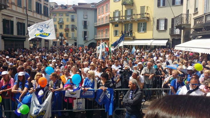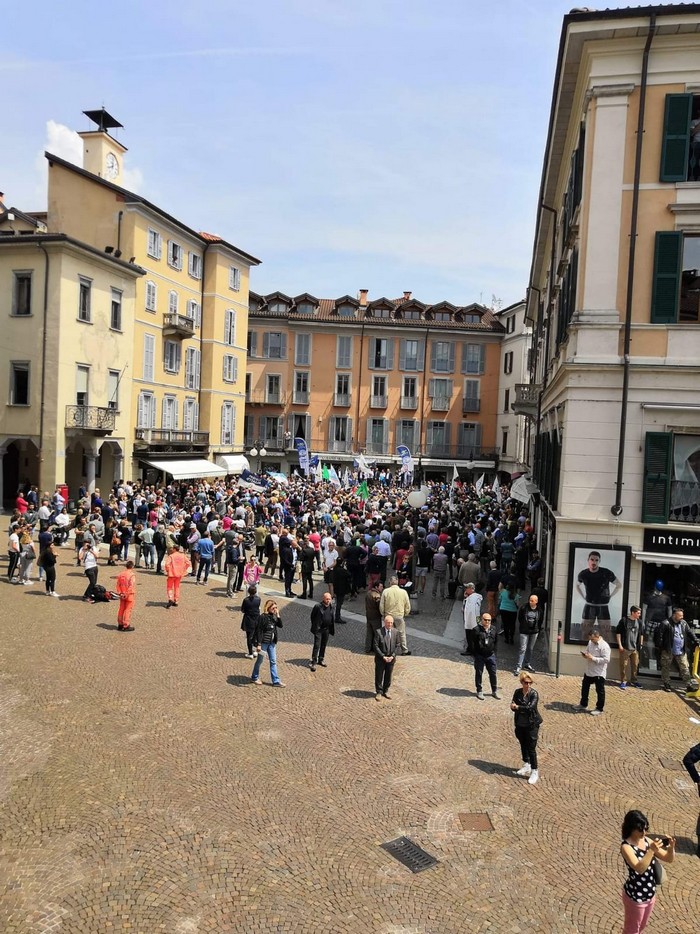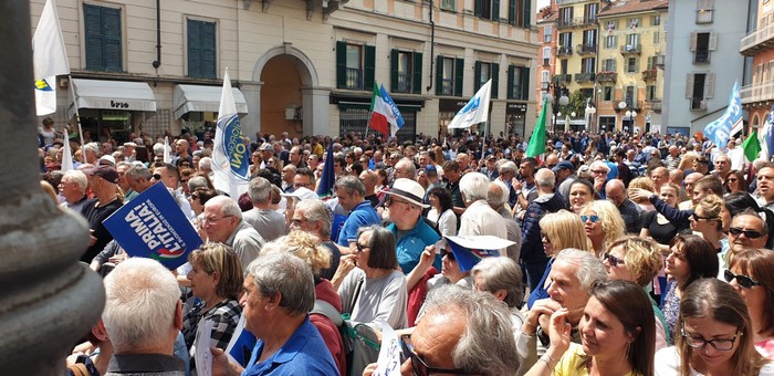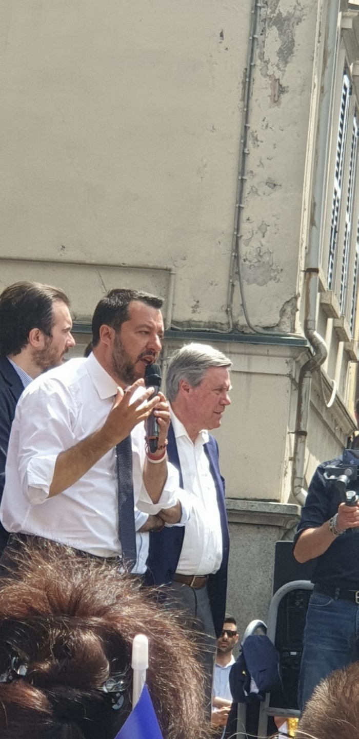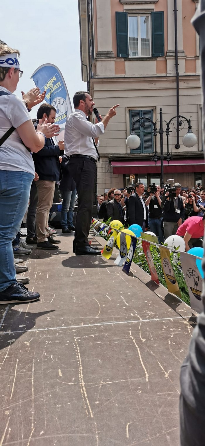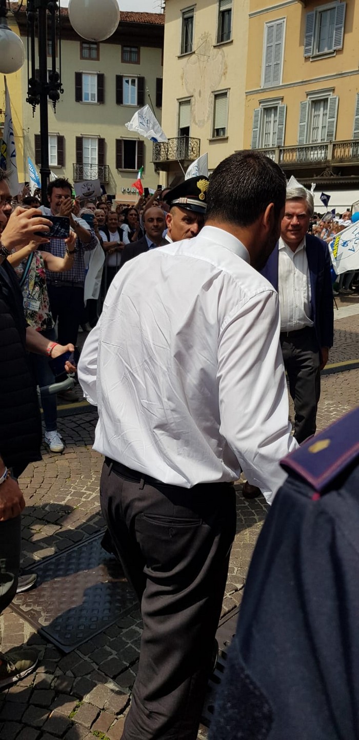 un comizio di poco più di mezzora che non ha tradito però l’attesa del popolo della Lega e dei fan di Matteo Salvini, che hanno atteso un po’ oltre mezzogiorno che il loro leader arrivasse a Verbania. Le frasi ad effetto sull’Europa da rifare e le tasse da ridurre, la rivendicazione dell’azione del governo su immigrazione e pensioni… il leader del Carroccio oggi in piazza Ranzoni a Intra ha battuto sui temi a lui cari, concentrando il comizio che ha chiuso la campagna elettorale della Lega nel Vco sulle questioni generali, legate più all’Europa (sul palco c’era il candidato a Strasburgo Alessando Panza, che è ossolano) che ai temi locali delle Regionali e delle Comunali. Naturalmente, al suo fianco, c’erano il capogruppo alla Camera e coordinatore piemontese Riccardo Molinari, il senatore Enrico Montani, il commissario Riccardo Perugini che hanno accompagnato il candidato alla Regione Alberto Preioni, gli aspiranti sindaci di Gravellona Toce e Verbania, Paolo Nocilla e Giandomenico Albertella, quest’ultimo circondato da numerosi candidati della sua lista. Altri erano tra il pubblico, in una piazza piena per metà che ha accolto circa 800 persone e che era gremita nel primo terzo, quello al di sotto del palco –collocato davanti al negozio Colombara– , dove tra bandiere, sciarpe e gadget si respirava quel clima di partecipazione, appartenenza e tifo che accompagna, nella frangia dei fedelissimi, le uscite pubbliche del “capitano” e che, alla fine, s’è messa in coda per gli immancabili selfie. Ingente lo spiegamento delle forze dell’ordine, che non hanno dovuto faticare a limitare il centinaio di contestatori venuti in piazza e mantenuti a distanza.