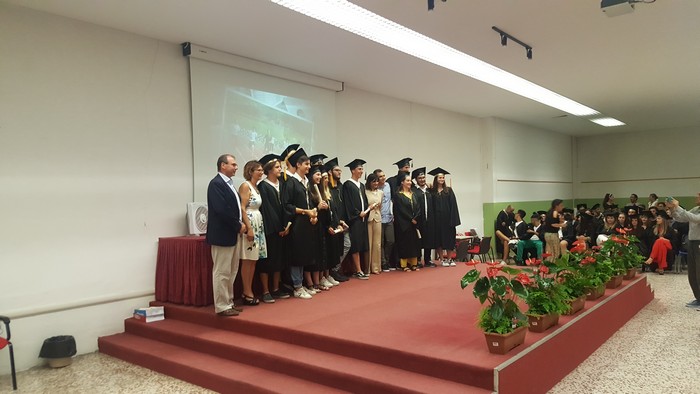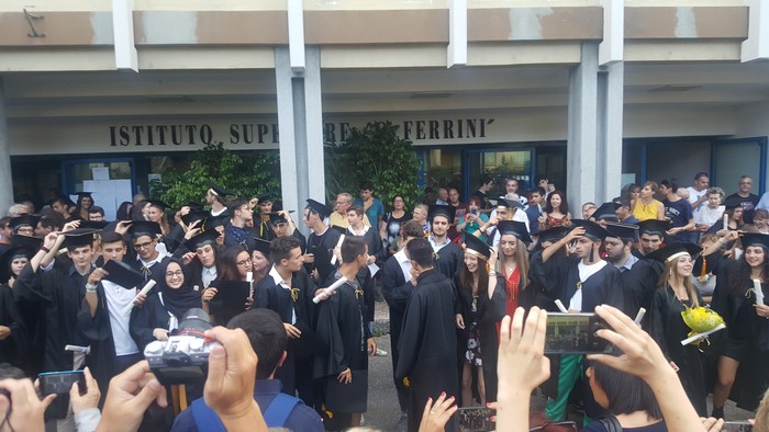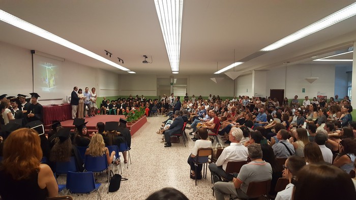 –come da prassi lanciato in aria a fine cerimonia (guarda il video)– davanti a prof., amici e parenti, s’è chiuso mercoledì il percorso di studi dei diplomati dell’istituto tecnico Ferrini-Franzosini di Verbania. Oltre 130 alunne e alunni, appartenenti agli otto indirizzi di studio che vanno dal campo economico a quello delle costruzioni passando per turismo e grafica, hanno partecipato alla cerimonia di consegna dei diplomi istituita qualche anno fa dal preside Santino Mondello, la cui tradizione è stata raccolta dal suo successore, Nadia Tantardini. È stata lei a chiamare sul palco d’una affollata e calda aula magna tutti i diplomati, classe per classe. E a introdurre le 17 borse di studio consegnate ad altrettanti studenti. Tre le ha finanziate la sezione Novara-Vco di Federmanager. Sono andate a studenti promossi in quarta con la media del 9: Lorenzo Losa, Sofia Cazzola, Valentina Cleopazzo. Novacoop ha riconosciuto l’impegno nella promozione della legalità e della cittadinanza attiva a Carolina Barzan, Sara Iani,
