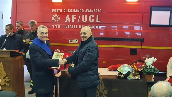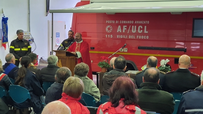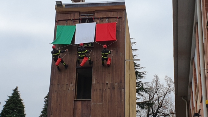 Al termine della cerimonia religiosa, mentre una delegazione del nucleo speleo-alpino-fluviale, calandosi dal castello di manovra hanno srotolato il Tricolore, nel piazzale i bambini della materna hanno vestito per un giorno i panni dei pompieri.