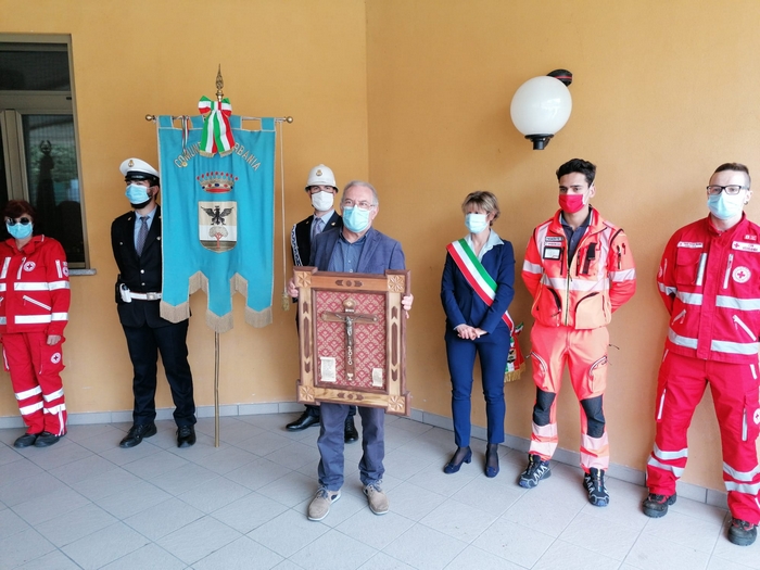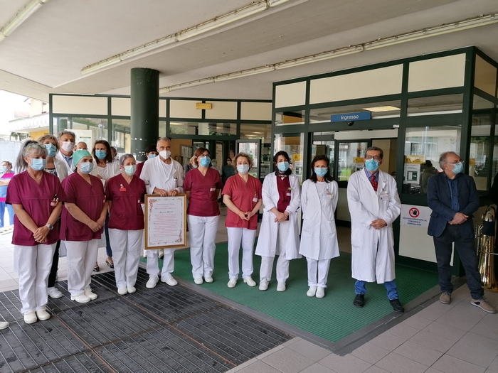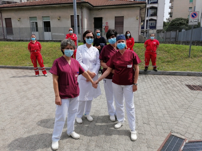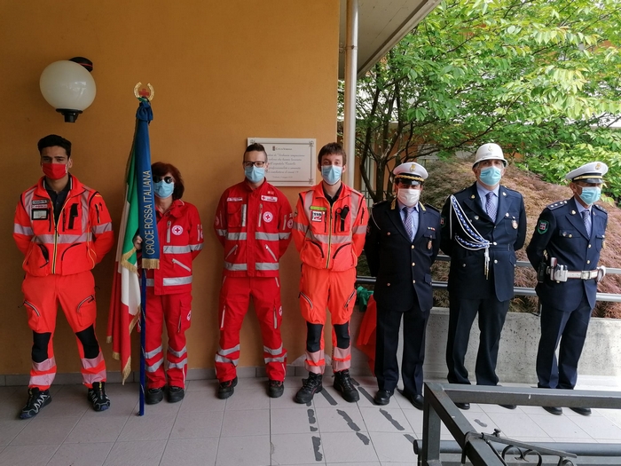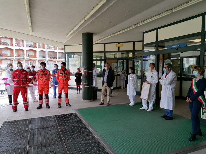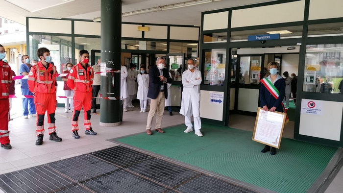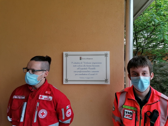 ringraziano tutti coloro che hanno lavorato all’ospedale Castelli con professionalità e umanità per combattere il covid 19”. È scritto su una targa, affissa sul muro a destra dell’ingresso dell’ospedale “Castelli”, il messaggio che il Consiglio comunale di Verbania ha scelto nel conferire la benemerenza 2020 agli operatori sanitari del nosocomio cittadino. Oggi, giorno di San Vittore patrono, il presidente dell’assemblea Giandomenico Albertella e il sindaco Silvia Marchionini hanno presenziato alla cerimonia tenutasi all’aperto, per rispondere alle norme che limitano gli assembramenti (anche se il numero di persone che s’è radunato era di circa una trentina). Hanno consegnato la pergamena con le motivazioni della benemerenza a Vincenzo Mondino, primario del reparto di Malattie infettive. Per l’Asl è intervenuto anche Francesco Garufi, direttore sanitario degli ospedali, e Liliana Maglitto, dirigente delle Professioni sanitarie. Di fronte a tanti rappresentanti del personale -medici e infermieri- e del mondo del volontariato (Croce Rossa, Croce Verde e Squadra nautica di salvamento) lo scoprimento della targa s’è accompagnato alle note della tromba di Paolo Milesi e di tre fiati dell’Ente musicale Città di Verbania.
