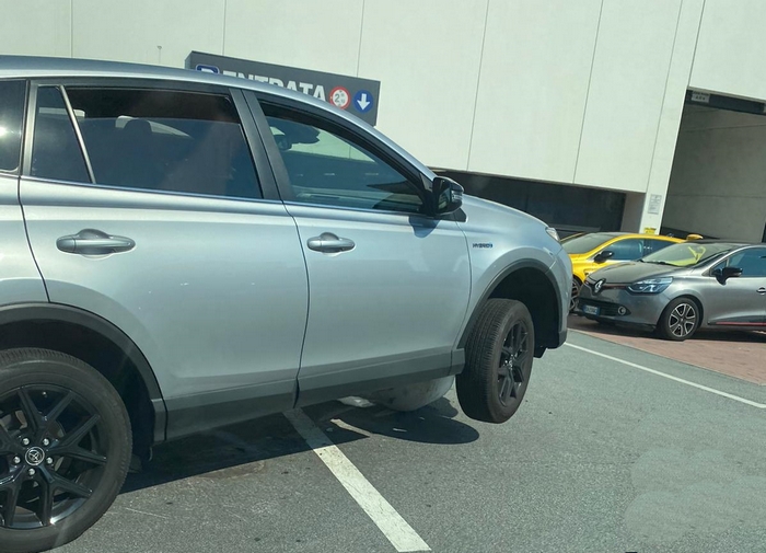 e l’auto ci è finita sopra, a… cavalcioni. Le tre immagini, scattate ieri pomeriggio nel parcheggio esterno della Lidl di Pallanza, mostrano il singolare incidente capitato allo sfortunato automobilista che, mentre circolava nel posteggio del supermercato, s’è trovato di fronte l’inaspettato ostacolo che, data la conformazione tondeggiante, è diventato una sorta di trampolino sopra il quale l’auto è salita per poi adagiarsi.