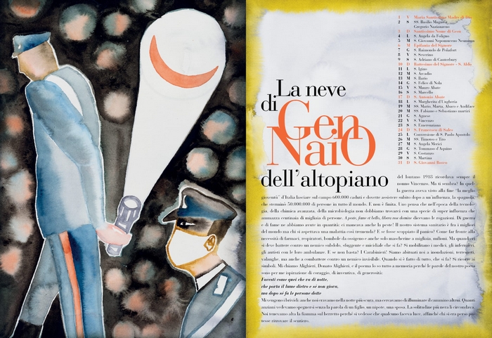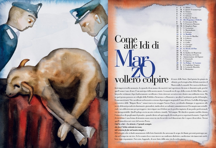 del quale nel 2021 corre il 700° anniversario della morte, il calendario storico dell’Arma dei carabinieri. Presentato oggi (naturalmente in forma virtuale, date le contingenze dell’epidemia di Covid-19) anche dal comando provinciale del Vco, è opera del professor Aldo Onorati, noto dantista; dello scrittore Valerio Massimo Manfredi; e con il tratto grafico di Francesco Clemente, artista della transavanguardia italiana, che ha curato le tavole. Il maresciallo Donato Alighieri, assurto a simbolo del buon carabiniere, fa da guida tra le dodici storie che accompagnano ciascun mese dell’anno. Racconti di vicende verosimili, ispirate a fatti veri, senza tempo, che nella forma richiamano la prosa del Sommo poeta e che trasmettono gli ideali dell’Arma.