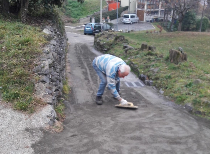 VERBANIA - 02-12-2020 -- Non hanno aspettato i tempi della burocrazia e, con il beneplacito del Comune, hanno fatto tutto da soli. Da tempo un gruppo di residenti della località Vigne alte di Zoverallo, al di sopra del vecchio ospedale intrese, lamenta le pessime condizioni in cui versano le vie Pisa e Archimede, strade vicinali interne alla frazione che, in parte sterrate, s’allagano ogniqualvolta viene a piovere. Il problema è stato segnalato ripetutamente all’Ufficio manutenzioni, ma non s’è mai arrivati a una soluzione definitiva. Così, sfruttando la buona volontà e le proprie capacità, nella giornata di ieri in sei hanno posato e tirato cinque metri cubi di cemento donato loro da un imprenditore edile. Lungo circa 140 metri lineari hanno realizzato una pavimentazione a prova di pioggia e hanno creato le condizioni affinché la pioggia finisca nel tombino tramite la cunetta. I sei sono il vicepresidente del Quartiere Est Ettore Francioli, i fratelli Paolo e Pierluigi Peraldo, Battista Violi, Eddo Conte e Daniele Erzego. La zona sistemata è quella tra le vie Pisa e Archimede, compreso un tratto adibito a posteggio. “È giusto aspettarsi che certi interventi di manutenzione siano portati a termine, ma bisogna anche darsi da fare – spiega Francioli –. Così ci siamo rimboccati le maniche, facendo tutto per nostro conto. Ritengo che questo sia il modo migliore per dimostrare il senso civico e fare un vero servizio alla comunità, nei fatti e non nelle parole”.