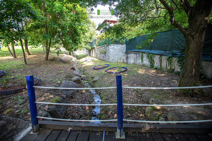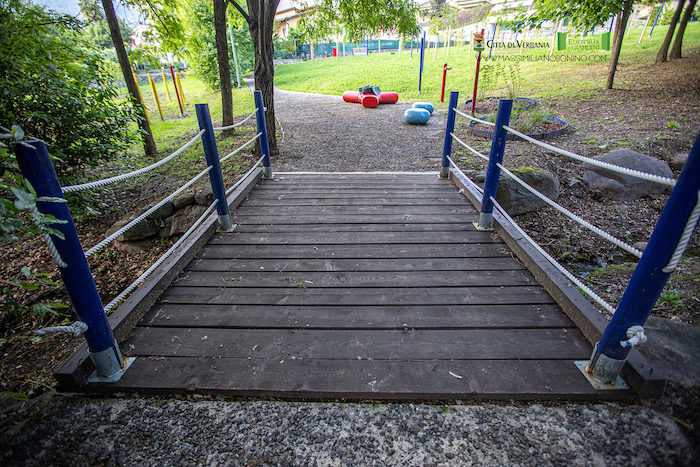 Giochi sensoriali, elementi lignei, colori, un corso d’acqua e la vegetazione, si intersecano in un racconto sensoriale vivace e contemporaneo.