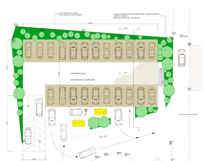 In questi giorni è partita la procedura per individuare l’impresa che effettuerà i lavori e realizzerà il progetto commissionato dalla società partecipata Stresa Servizi all’architetto verbanese Autilio D’Andria. Sarà un parcheggio “leggero”, che costerà (da progetto, salvo ribassi o risparmi) circa 400.000 euro per 49 stalli (attualmente sono poco più d’una ventina) distribuiti su due piani. La struttura portante è prefabbricata di metallo per accogliere i due livelli di sosta. Il primo, quello a raso all’altezza del lido, sarà sormontato da un secondo, raggiungibile con una rampa di circa il 20% di pendenza. Il rivestimento delle facciate sarà in corten, materiale approvato dalla Soprintendenza che l’ha giudicato compatibile con il delicato contesto paesaggistico del golfo Borromeo. Per mitigare l’impatto visivo il progettista, che già aveva lavorato negli anni ‘90 al lungolago di Pallanza con l’illustre botanico Pietro Hillebrand, ha scelto alcune essenze locali o che richiamano il patrimonio verde del lago: camelie, corniolo giapponese e cipresso.