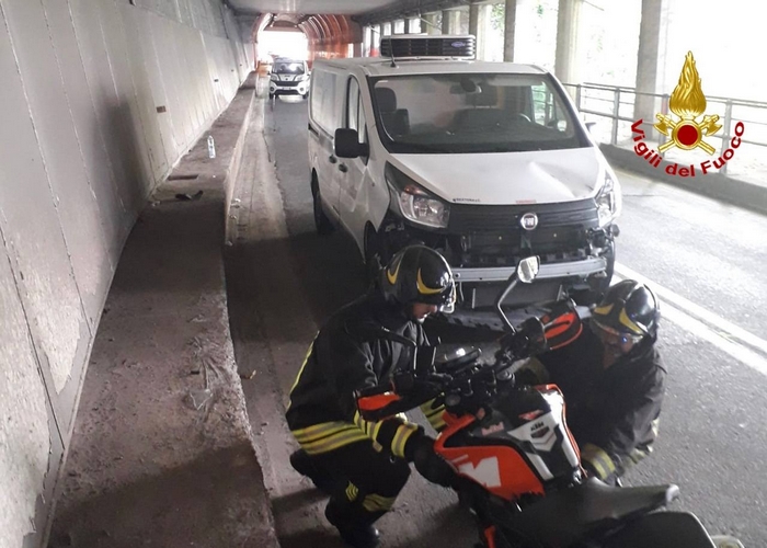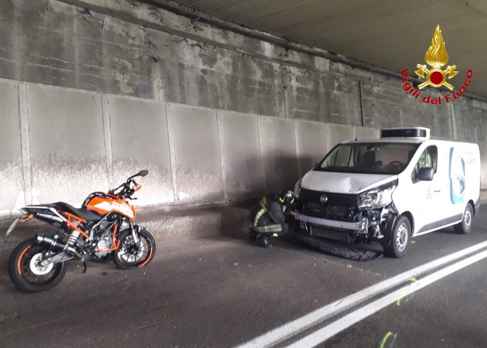 LAVENO M. - 21-07-2023 -- Ha riportato ferite da codice giallo il motociclista di 23 anni che, attorno alle 17 di oggi, è rimasto coinvolto in un incidente stradale nella galleria del Sasso Galletto, tra Laveno Mombello e Castelveccana. Per cause ancora da appurare nel tunnel lungo la strada provinciale 69 si sono scontrati frontalmente una motocicletta di grossa cilindrata e un furgone frigo. Sul posto sono intervenuti i vigili del fuoco con un’autopompa e un fuoristrada, oltre a personale del 118.