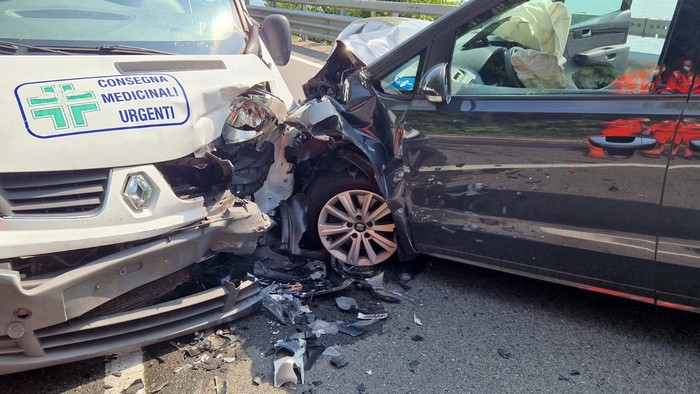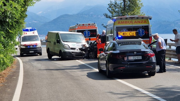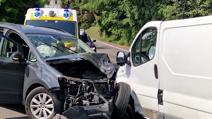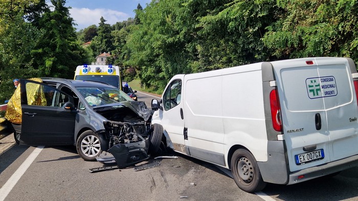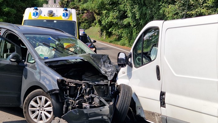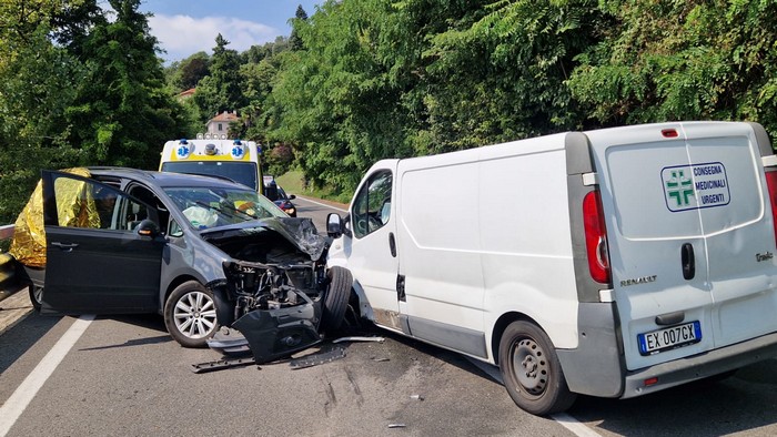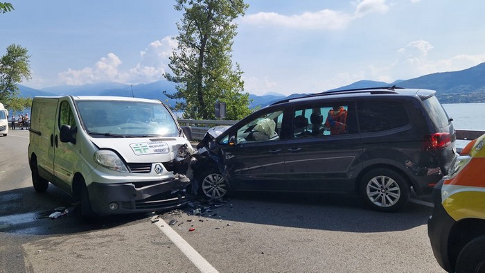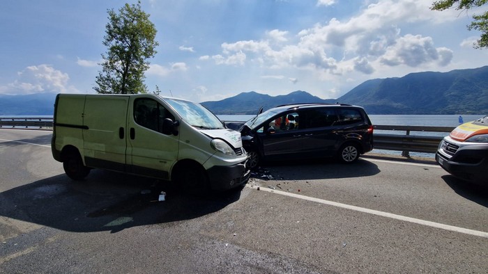 GHIFFA - 31-07-2023 -- Feriti e traffico in tilt stamane sulla statale 34 a Ghiffa. Attorno alle 11, all'altezza del chilometro 20+600, un'auto Seat con a bordo una famiglia di stranieri di nazionalità tedesca s'è scontrata frontalmente con un furgone che consegna i farmaci.