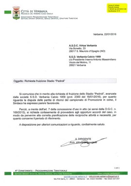 A prescindere dalle motivazioni, Inserra ha in mano dal 22 gennaio la lettera firmata dal dirigente del settore Sport del Comune che concede – perché “il Sindaco ha espresso parere favorevole”, completando la retromarcia rispetto alle posizioni di luglio – il “Pedroli” al Verbania per i match interni del girone di ritorno, col solo obbligo di accordarsi per l’affitto con Giuseppe D’Onofrio, presidente della Virtus e gestore sino all’estate 2016.
