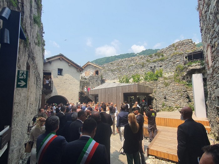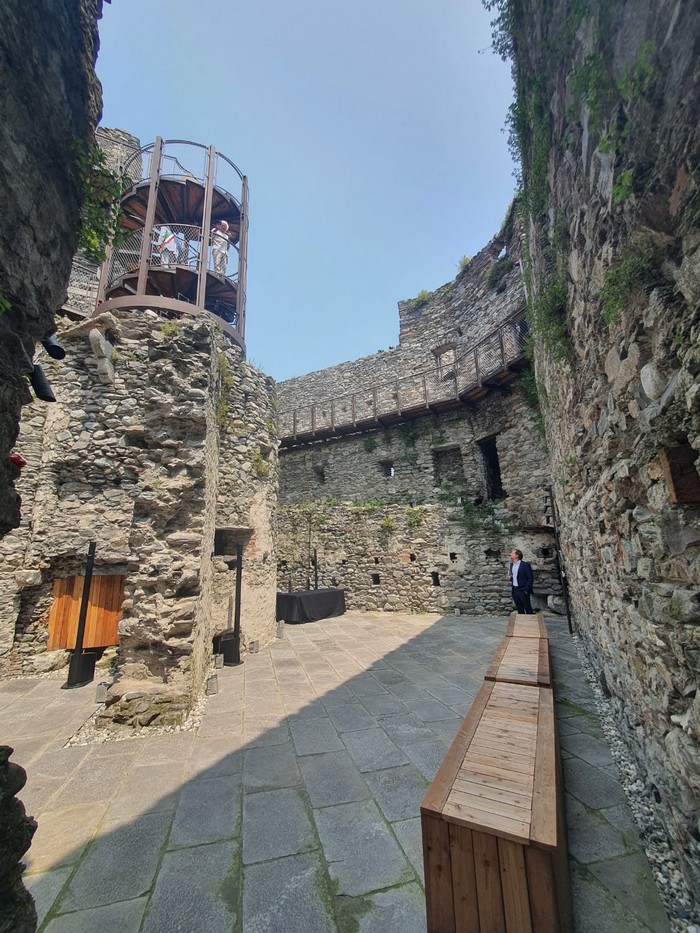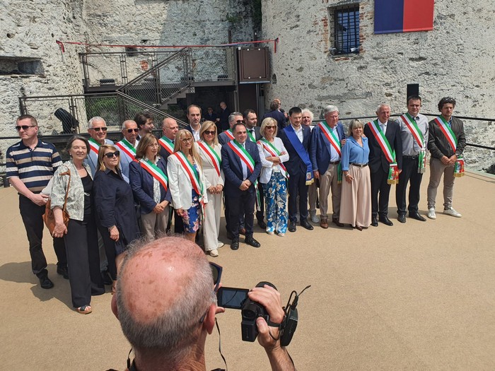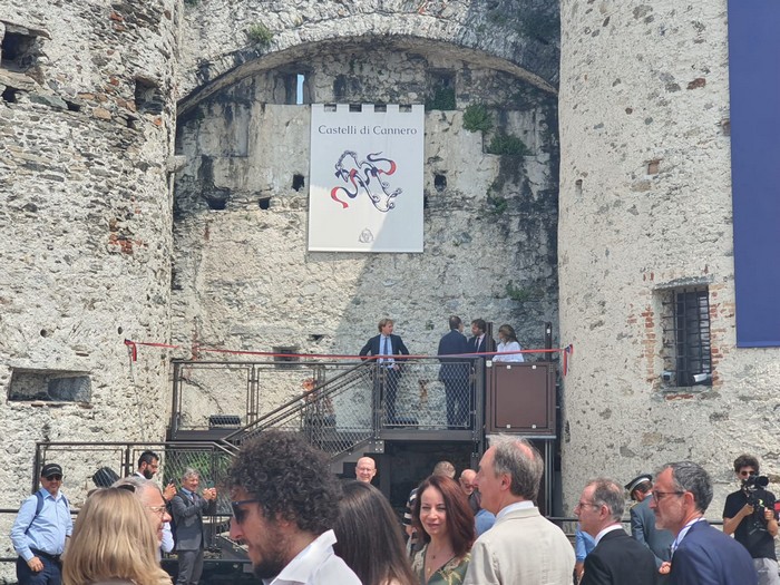 VERBANIA - 12-06-2025 -- Una cerimonia sobria, informale. Il taglio del nastro e la visita alle torri e alle corti dell’antica fortezza hanno ufficialmente inaugurato, oggi, la seconda vita dei Castelli di Cannero. La rocca Vitaliana, la cui storia è strettamente legata a quella della famiglia Borromeo, feudatari del Lago Maggiore, è rinata grazie all’impegno della famiglia. Del principe Vitaliano, che per diciassette anni ha dialogato con la Soprintendenza per definire quello che, è a tutti gli effetti, il restauro di un bene storico e culturale; e della moglie Marina, che ha seguito da vicino i lavori. Sono stati loro a tagliare il nastro all’evento che ha raccolto le massime autorità del territorio: non solo del Verbano Cusio Ossola, ma anche del Verbano novarese e della Lombardia. C’erano il prefetto di Varese e il facente funzione di Verbania, c’era l’assessore regionale al Turismo del Piemonte Marina Chiarelli, e una nutrita delegazione dei sindaci del Verbano che, con la fascia tricolore, hanno accolto l’inaugurazione.