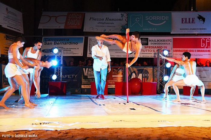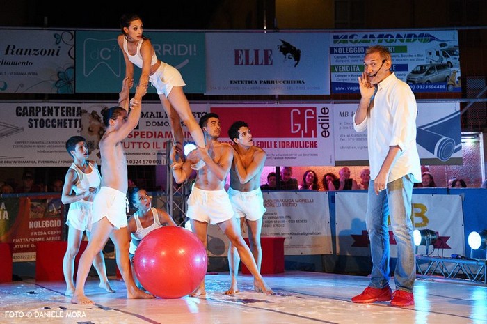 che s’è abbattuto sul Verbano a metà pomeriggio ha battuto Andrea Zorzi, i Kataklò e l’organizzazione di Beach for Babies. Ieri sera, nella prima giornata della kermesse benefico-sportiva che si tiene in piazza San Vittore a Intra, a un tratto sembrava che lo spettacolo di sport e danza raccontato e recitato dall’ex azzurro di volley dovesse saltare. Ma, passate le nuvole, un febbrile lavoro di allestimento del palco (assi di legno posate sulla sabbia) ha permesso ai Kataklò di iniziare il loro show, che è stato un’autentica suggestione. Un pubblico numerosissimo, di almeno 600 persone, ha ammirato le evoluzioni dei sei ginnasti della compagnia che, sotto la direzione di Giulia Staccioli, hanno messo in scena il racconto che l’ex pallavolista, ormai calatosi nei panni dell’attore e dell’intrattenitore, ha fatto della sua straordinaria carriera sportiva, fatta di tante vittorie ma anche di sconfitte e insuccessi. Il filo conduttore dello show “La migliore squadra del secolo” non sono stati però i risultati sportivi sul campo, ma la filosofia di vita che questo sport al quale il sedicenne Zorzi di dedicò quasi per caso “perché ero tanto, troppo alto e lo consigliò ai miei genitori il professore di educazione fisica del liceo classico” e che gli ha aperto la strada della vita.