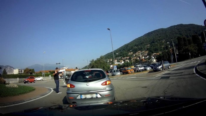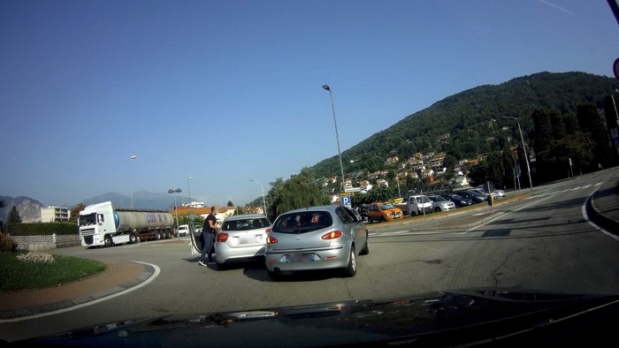 la coda che si forma alla rotonda, un automobilista che finisce “lungo” e tampona l’auto che lo precede. È questa la dinamica del piccolo incidente accaduto ieri mattina in corso Nazioni Unite, nel rondò di raccordo con via Zara e via Madonna di Campagna, proprio di fronte alla questura. Quelle che pubblichiamo in sequenza sono le fotografie tratte dal video ripreso dalla telecamera installata dall’auto che seguiva quella del tamponatore. Nel filmato, che per ragioni di privacy non possiamo mostrare per intero (ma che possiamo mostrare al tamponato, qualora ne avesse bisogno, e può contattarci), si vede l’urto, il conducente del primo veicolo che scende e con un gesto eloquente mostra il suo disappunto, quello del secondo che, invitato a accostare per compilare le scartoffie, riparte e accelera con decisione – anche azzardando due sorpassi pericolosi con la doppia striscia continua – in direzione di Fondotoce, dileguandosi. Al di là della telecamera, che s’è rivelata un utile strumento, con tutti i testimoni (l’incidente è accaduto alle 9 circa) presenti chissà come pensava di passare inosservato il tamponatore.