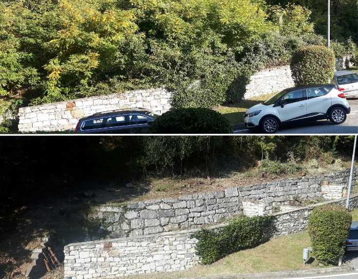Nel dossier fotografico che proponiamo si possono vedere le condizioni generali della zona prima e dopo la pulizia e la zona del bosco che invade la strada. La foto sopra mostra il prima e il dopo l'intervento.