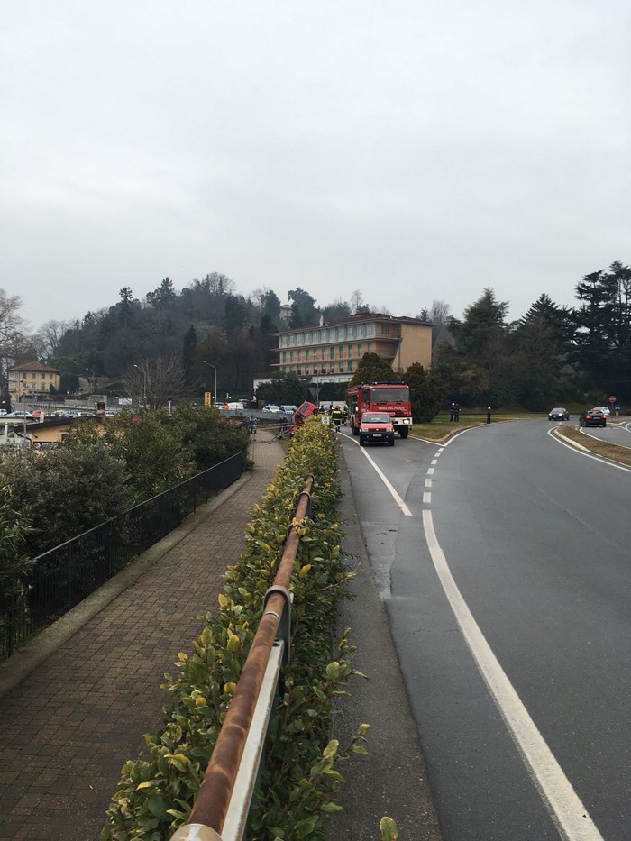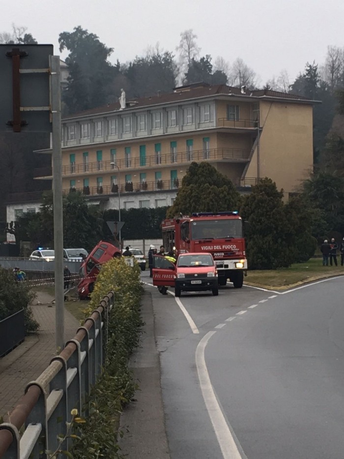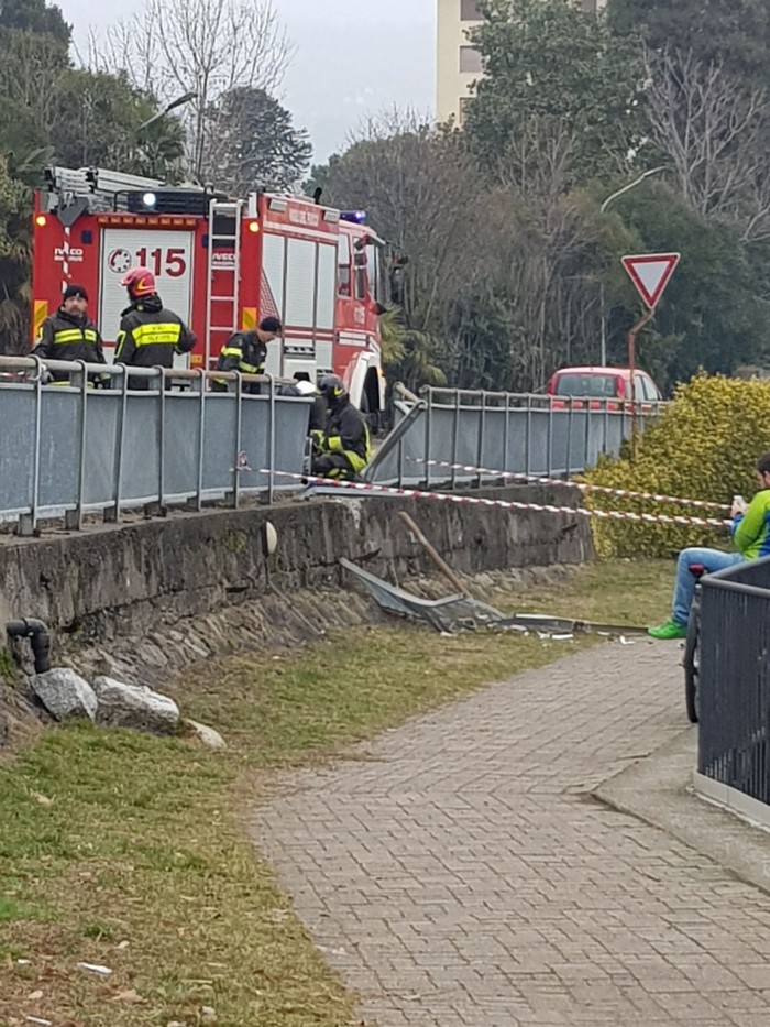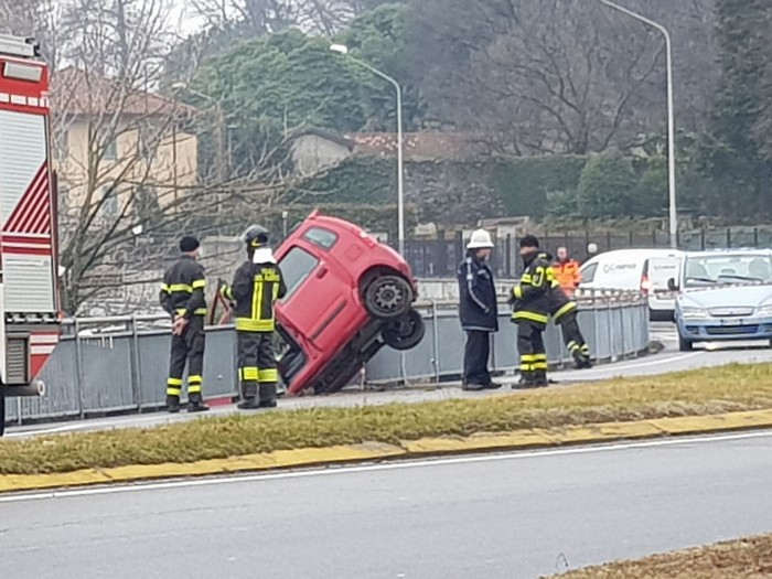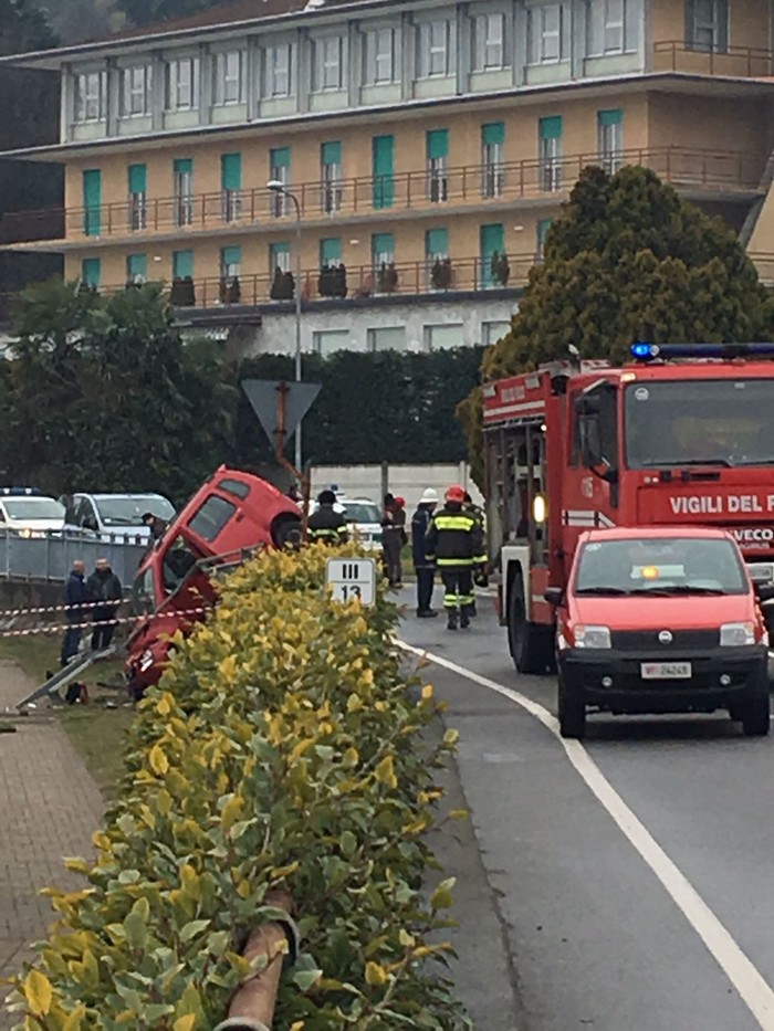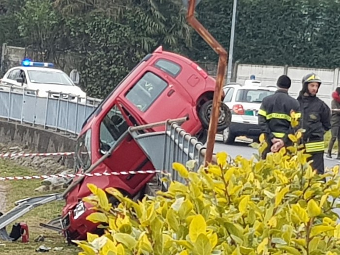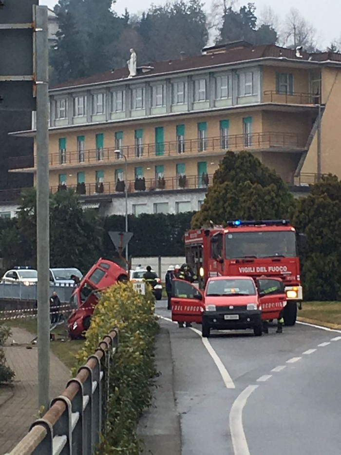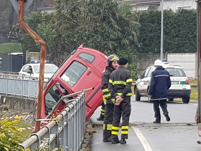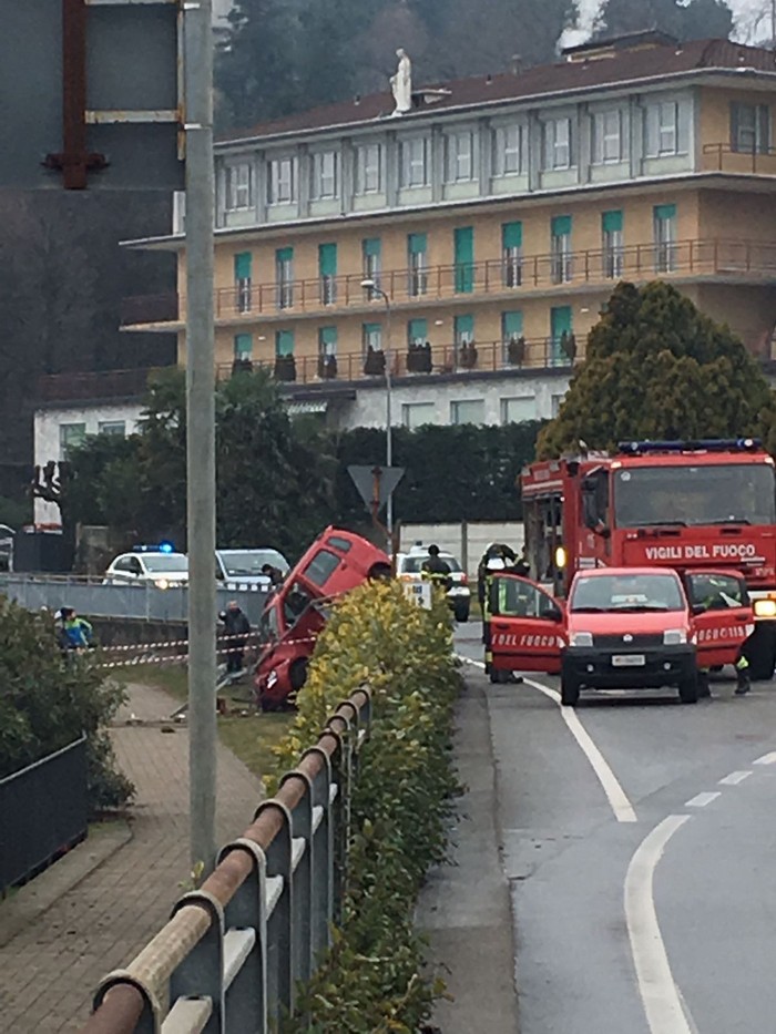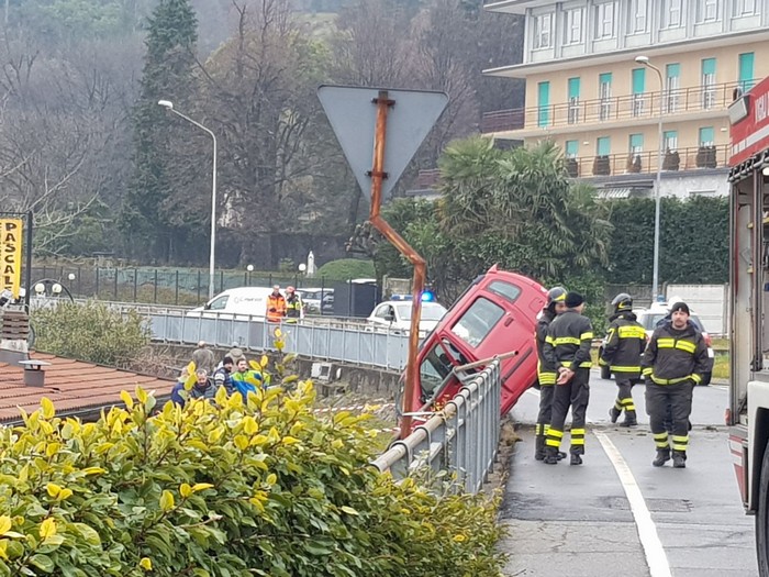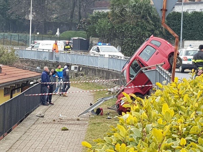 e s’è schiantato contro le barriere della statale, rischiando di finire sul tetto del ristorante e adagiandosi oltre la carreggiata sulla pista ciclabile. È questa la dinamica dell’incidente stradale accaduto attorno alle 10 di questa mattina in via Vittorio Veneto. Una Suzuki Ignis condotta da un uomo di Verbania che percorreva corso Europa in direzione di Intra, all’improvviso e per cause ancora da accertare, non ha proseguito per la sua strada ed è finita dritta, oltrepassando l’aiuola e andando a cozzare frontalmente contro le barriere protettive che delimitano la statale e sovrastano l’ex porto turistico di Pallanza. l’impatto è accaduto all’altezza del ristorante Pascale. Le ringhiere d’acciaio si sono squarciate ma hanno trattenuto l’auto, rimasta sporgente per circa un metro oltre la strada e che, sospesa nel vuoto, s'è poi adagiata con il muso sullo sterrato a lato della ciclabile. Sul posto è giunta l’ambulanza, che ha trasportato l’autista – solo nell’abitacolo – al Dea dell’ospedale “Castelli” per accertamenti, vigili del fuoco, carabinieri e polizia municipale. Più tardi il carro attrezzi ha recuperato la Suzuki (guarda il video).
